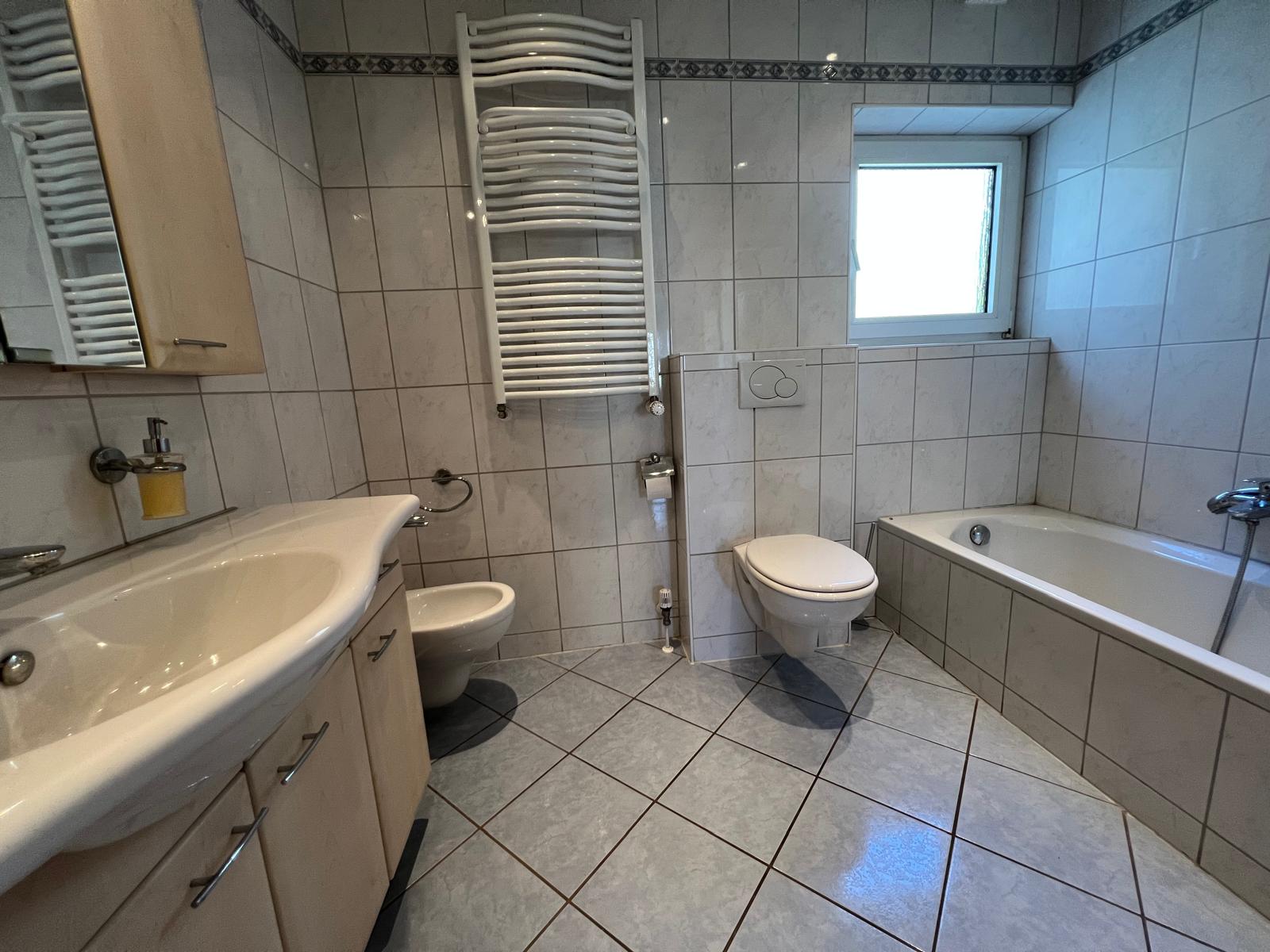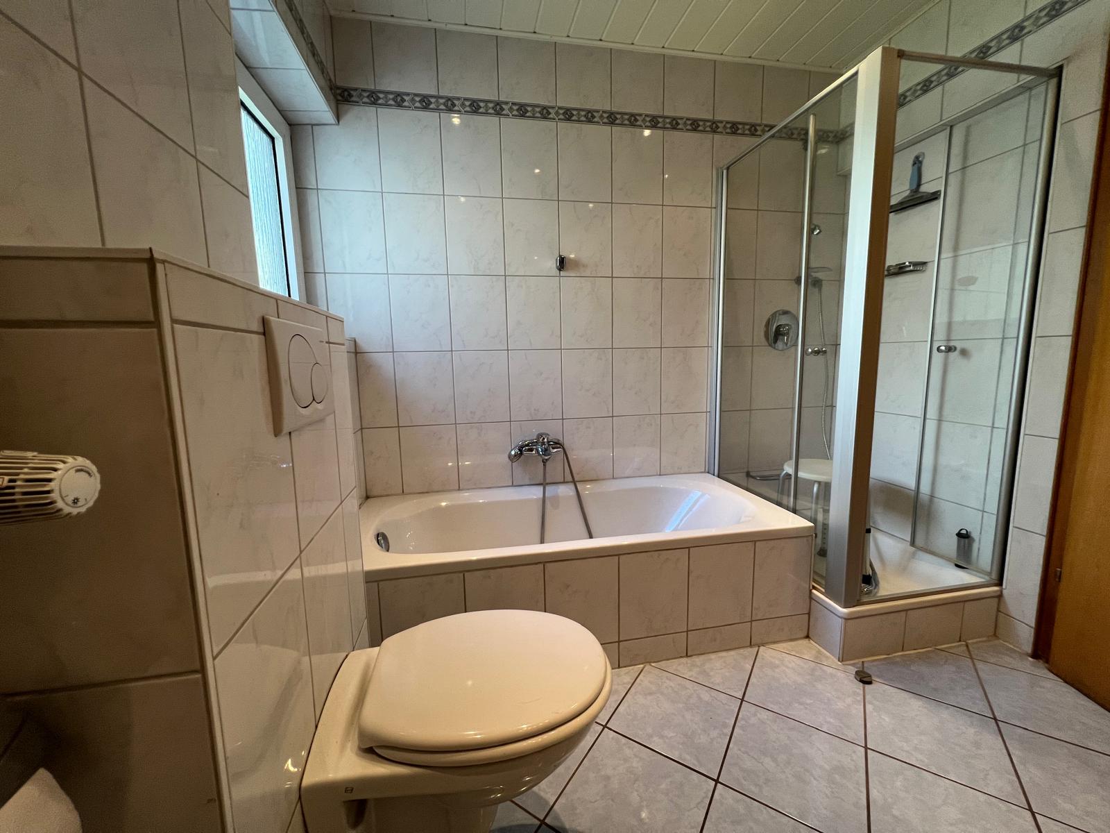 Das großes Badezimmer im EG wurde 2003 renoviert und verfügt über Wanne, Dusche, Bidet und WC. Bei dieser Renovierung wurde eine Fußbodenheizung im Bad und in der Wohnküche verlegt.