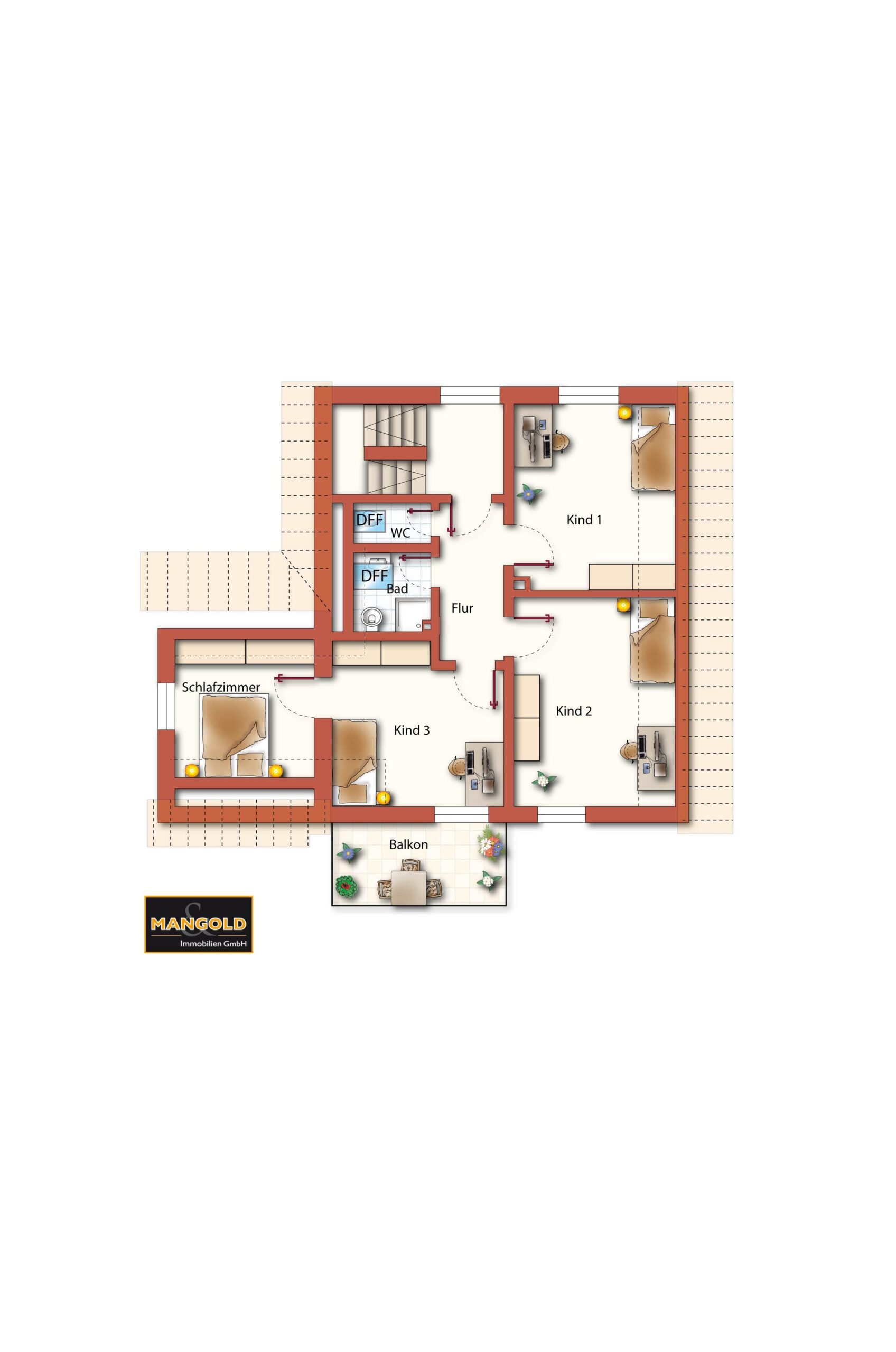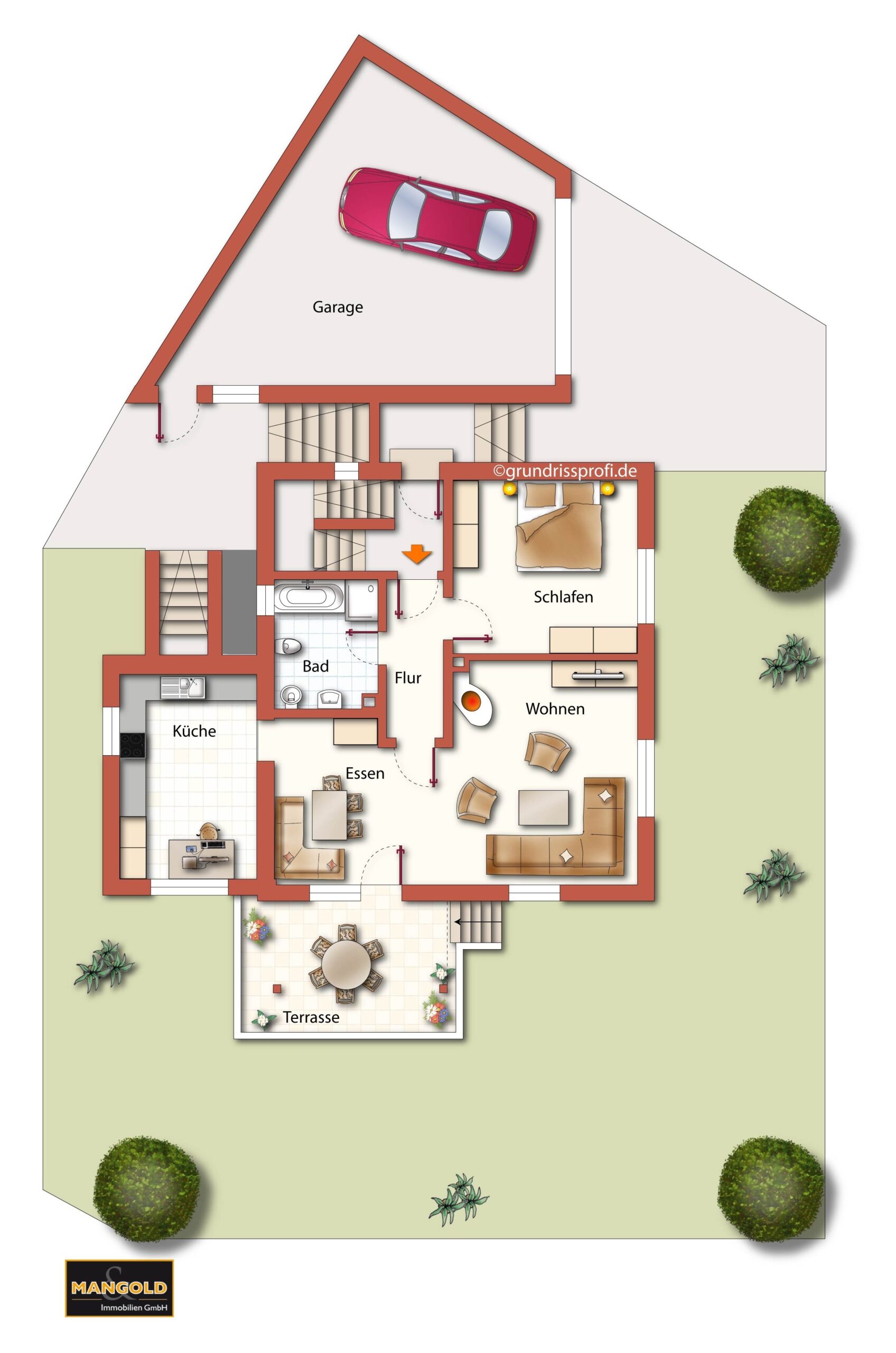 Achtung: Die auf dem Grundriss eingezeichnete Treppe von der Terrasse in den Garten existiert nicht. Hier ist ein stufenloser Übergang direkt in den Garten.