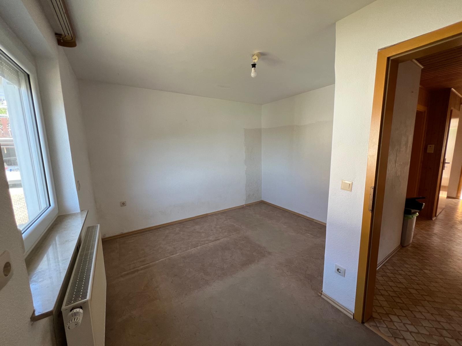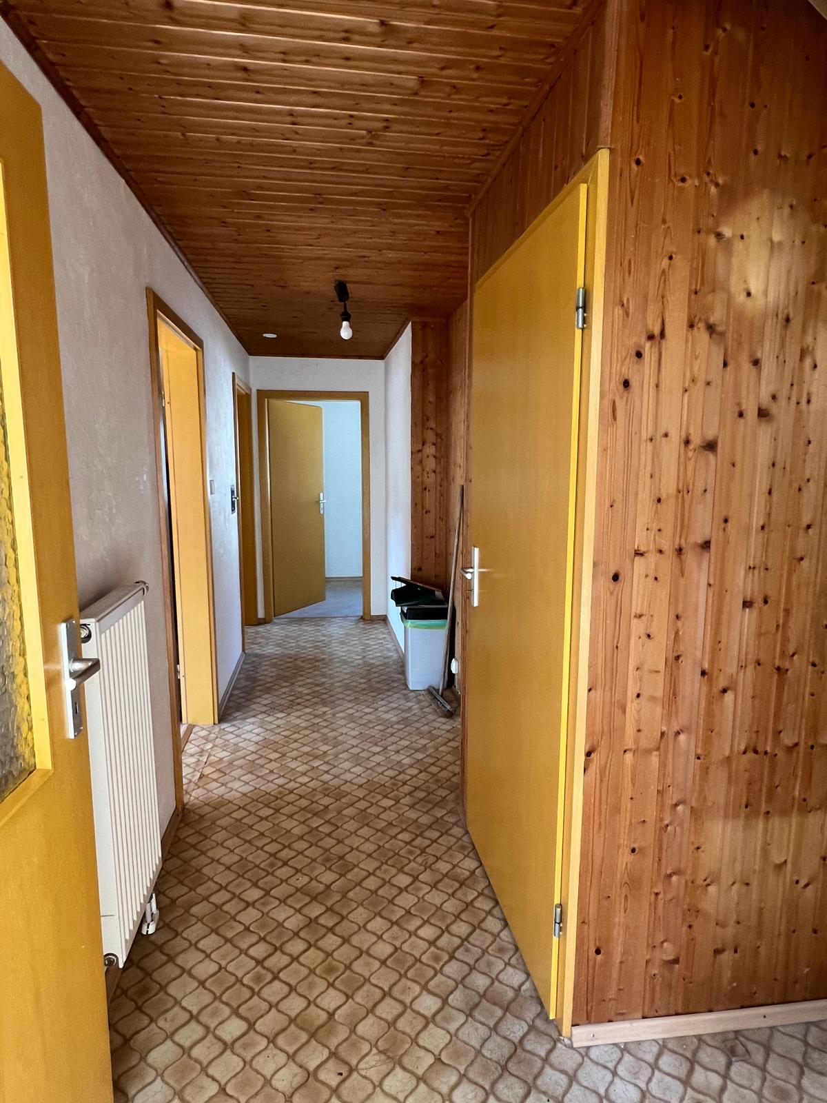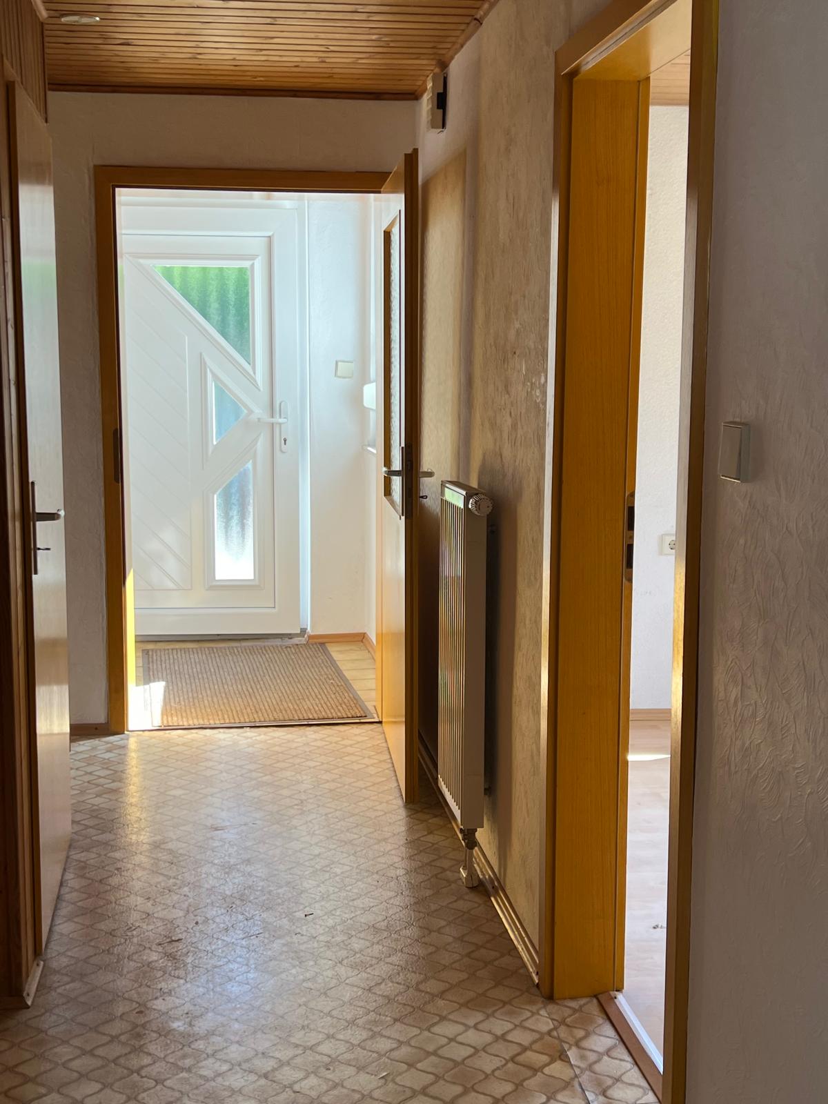 Im Inneren des Hauses befinden sich drei kleine Schlafzimmer, ein Badezimmer, Gäste-WC, sowie ein Wohnzimmer. Der Essbereich ist in der Küche mit integriert. Die Zentralheizung sorgt für wohlige Wärme in allen Räumen. Eine Terrasse über der Garage lädt zum Entspannen und Verweilen im Freien ein. Das Haus ist voll unterkellert.