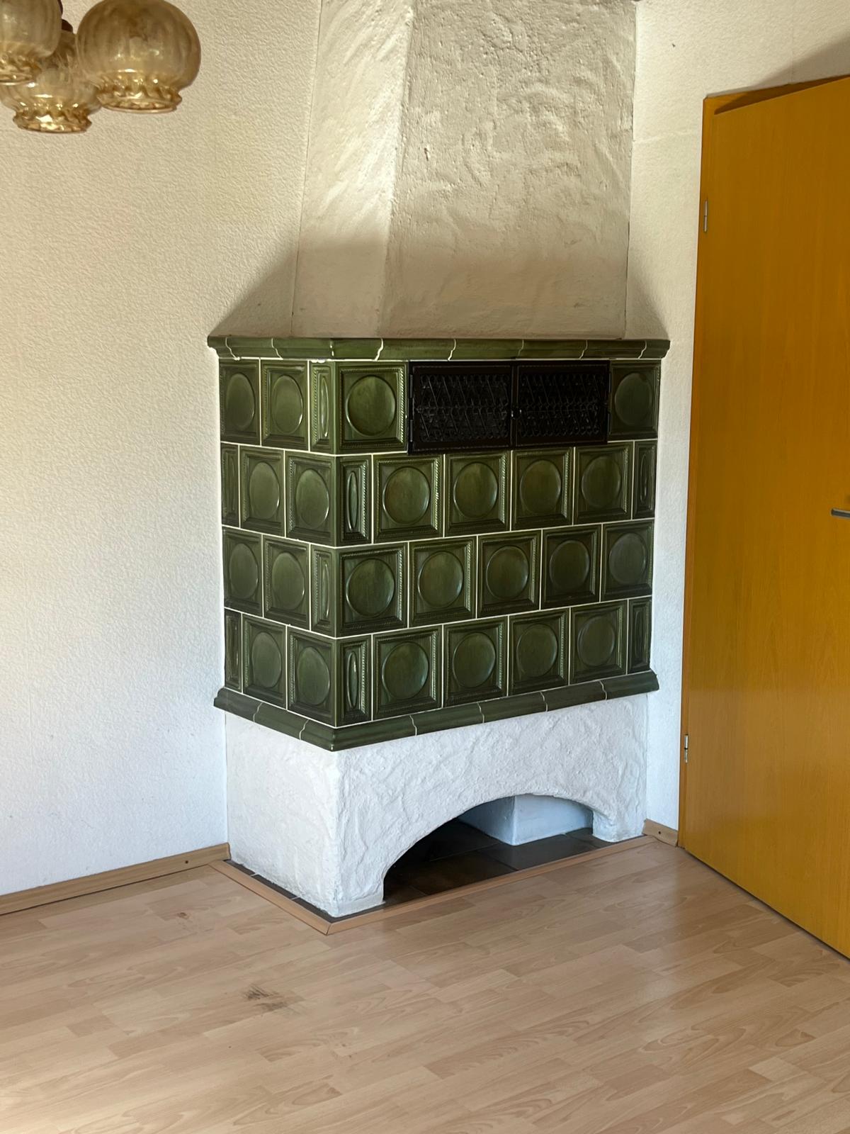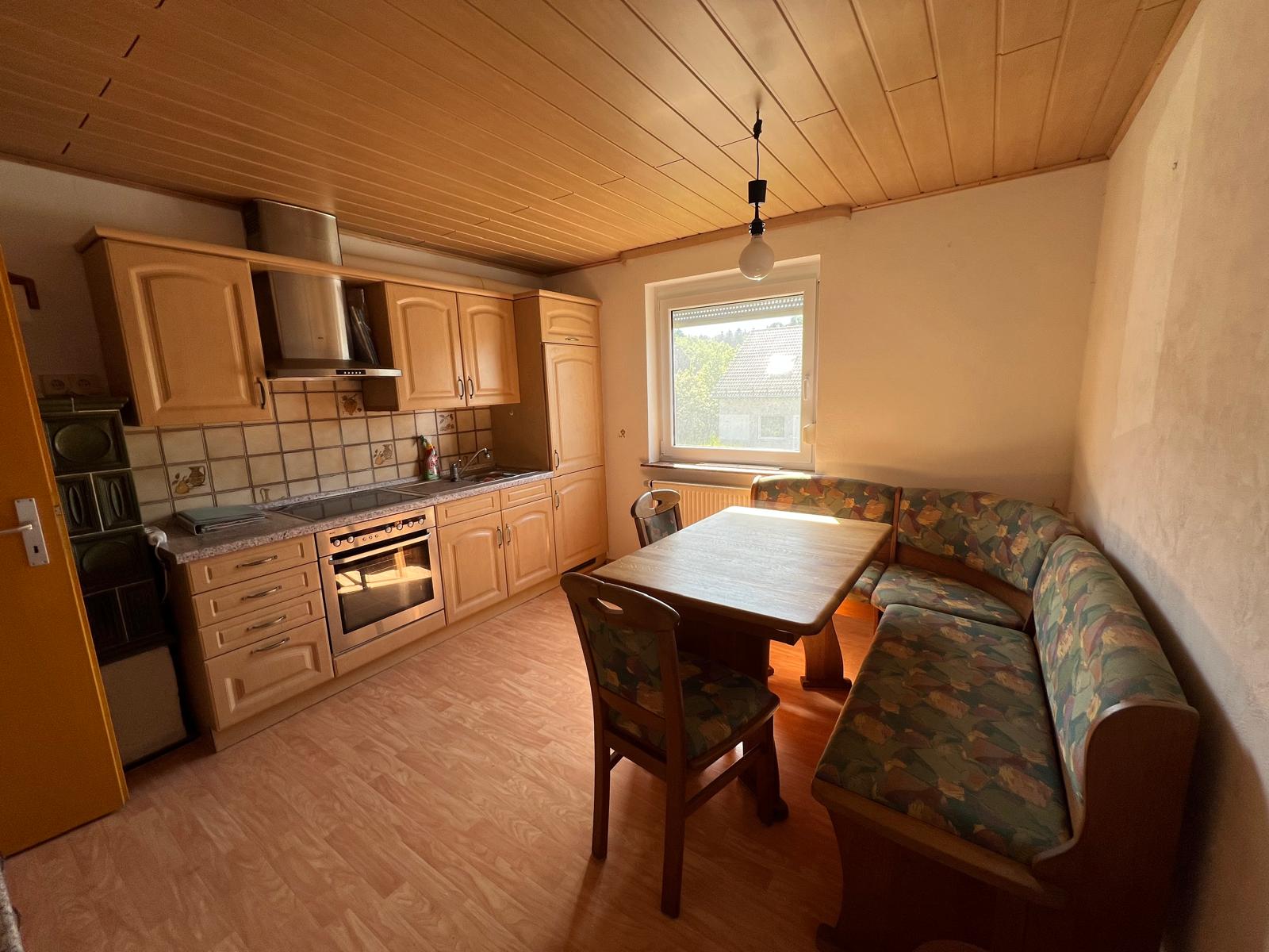Die Immobilie verfügt über ein Badezimmer mit einer Badewanne sowie einer separaten Toilette. Zudem ist eine Einbauküche im Haus vorhanden. Der Kachelofen ist mittig zwischen Wohnküche und Wohnzimmer gesetzt, so das beide Zimmer damit erwärmt werden können. Alle Fenster sind mit Rollläden ausgestattet, um die Räume bei Bedarf abzudunkeln. Die Qualität der Ausstattung wird als einfach beschrieben, was darauf hinweist, dass es sich um eine solide Grundausstattung handelt.