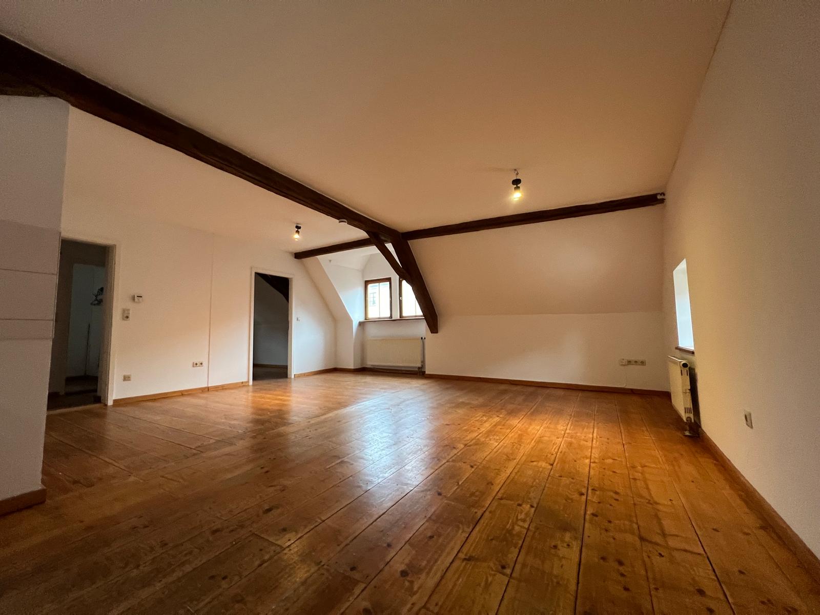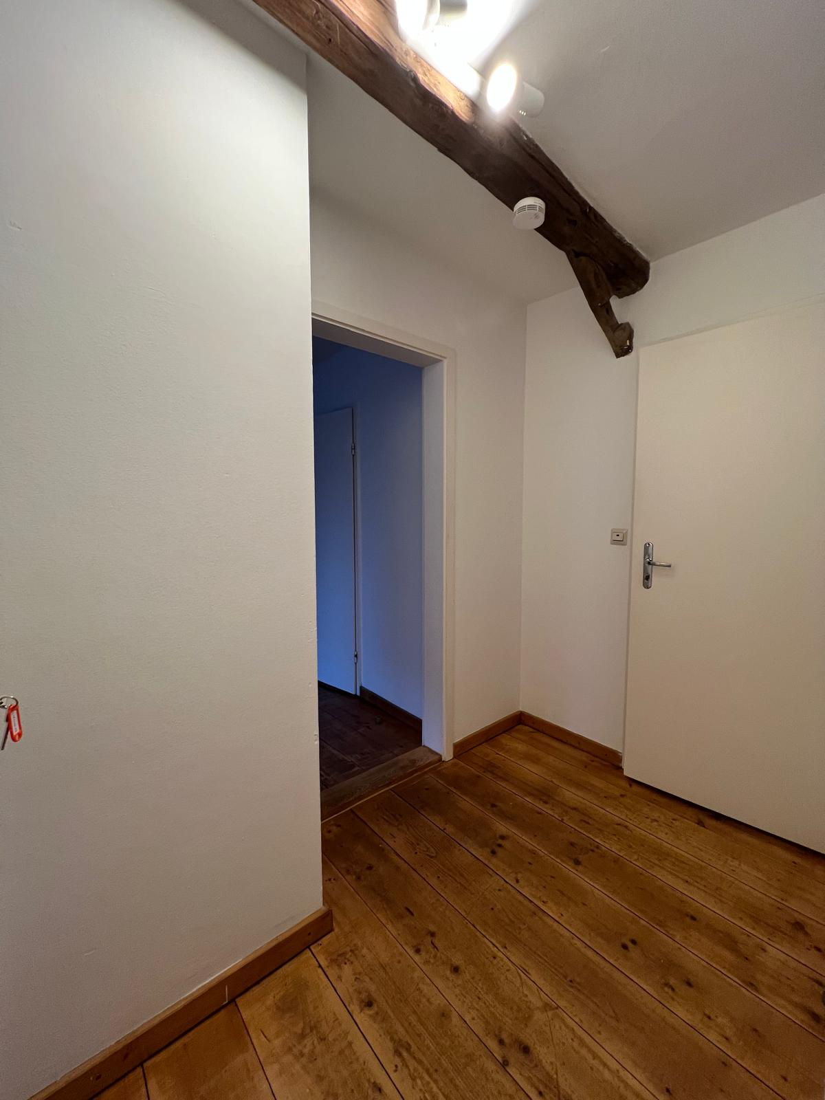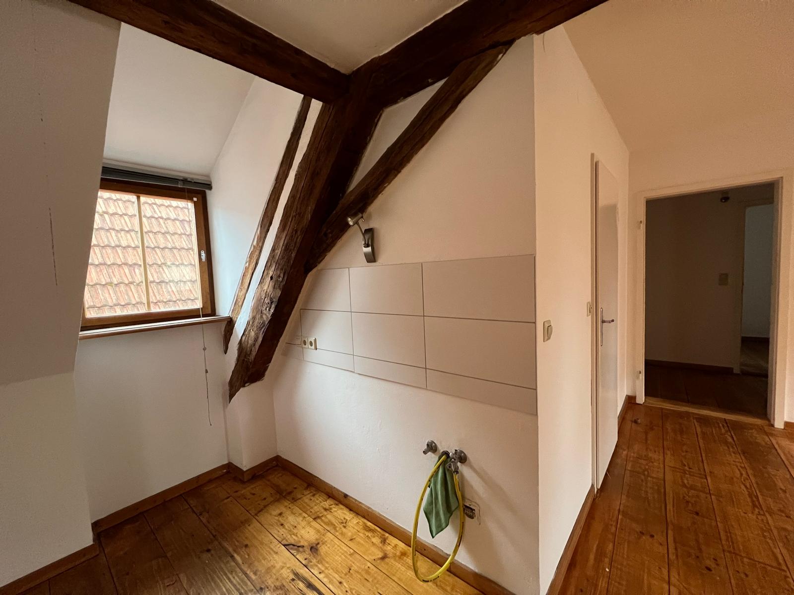 Der Boden in der gesamten Wohnung ist mit alten Holzdielen ausgelegt. Die Dielen und die Fachwerkbalken verleihen der Wohnung eine warme und gemütliche Atmosphäre und sorgen für ein angenehmes Wohngefühl. Insgesamt bietet die Immobilie eine solide Basis für ein komfortables Zuhause.