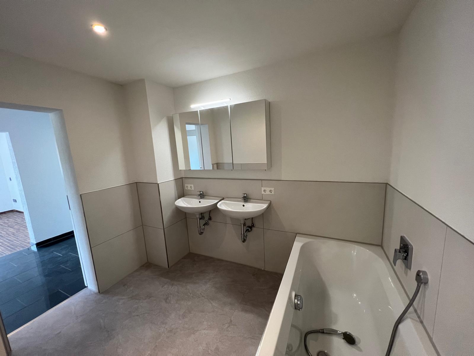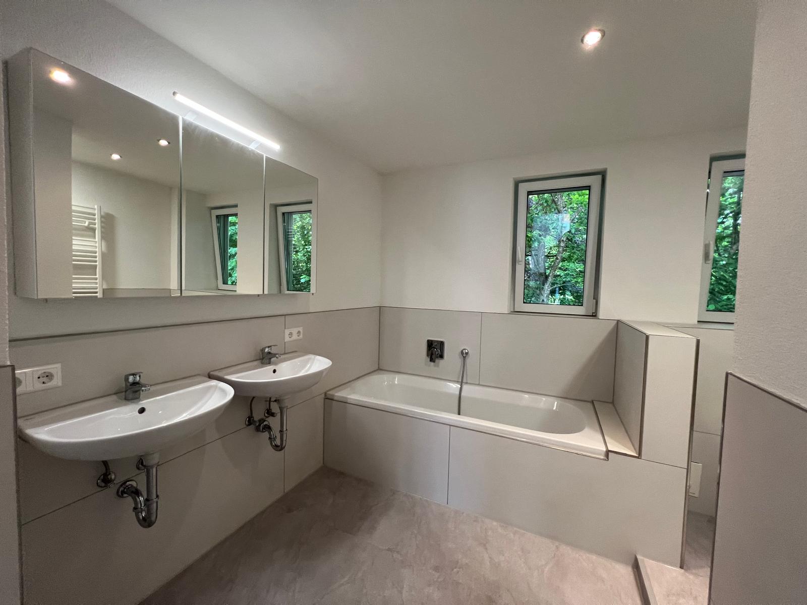 Das Badezimmer ist mit einer Badewanne, begehbarer Dusche, zwei Waschbecken und einer Toilette ausgestattet.